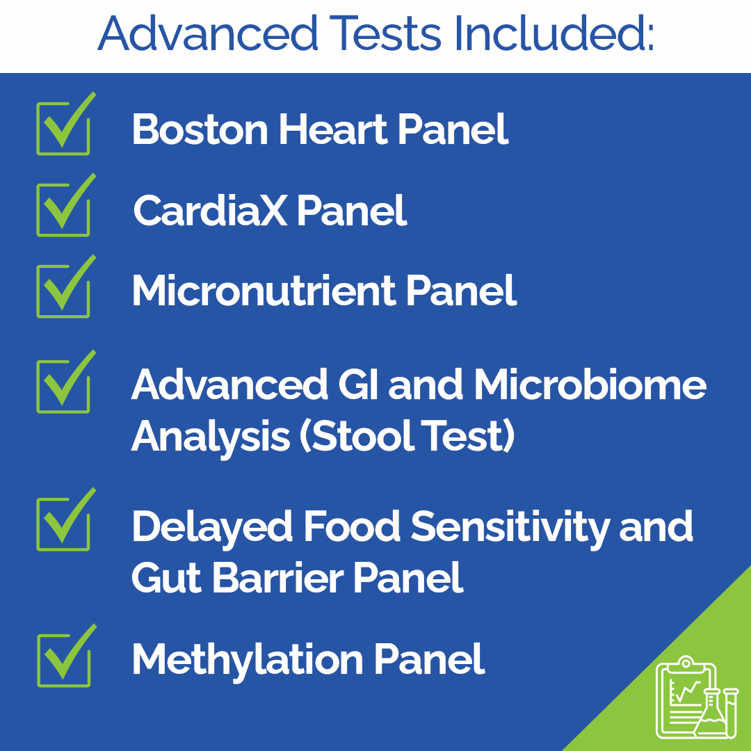 Advanced GI and Microbiome Analysis (Stool Test) -assesses gut bacteria, yeast, parasites, function, leaky gut, inflammation & microbial imbalances that drive systemic inflammation, insulin resistance & metabolic dysfunction which contribute to cardiovascular risk. |