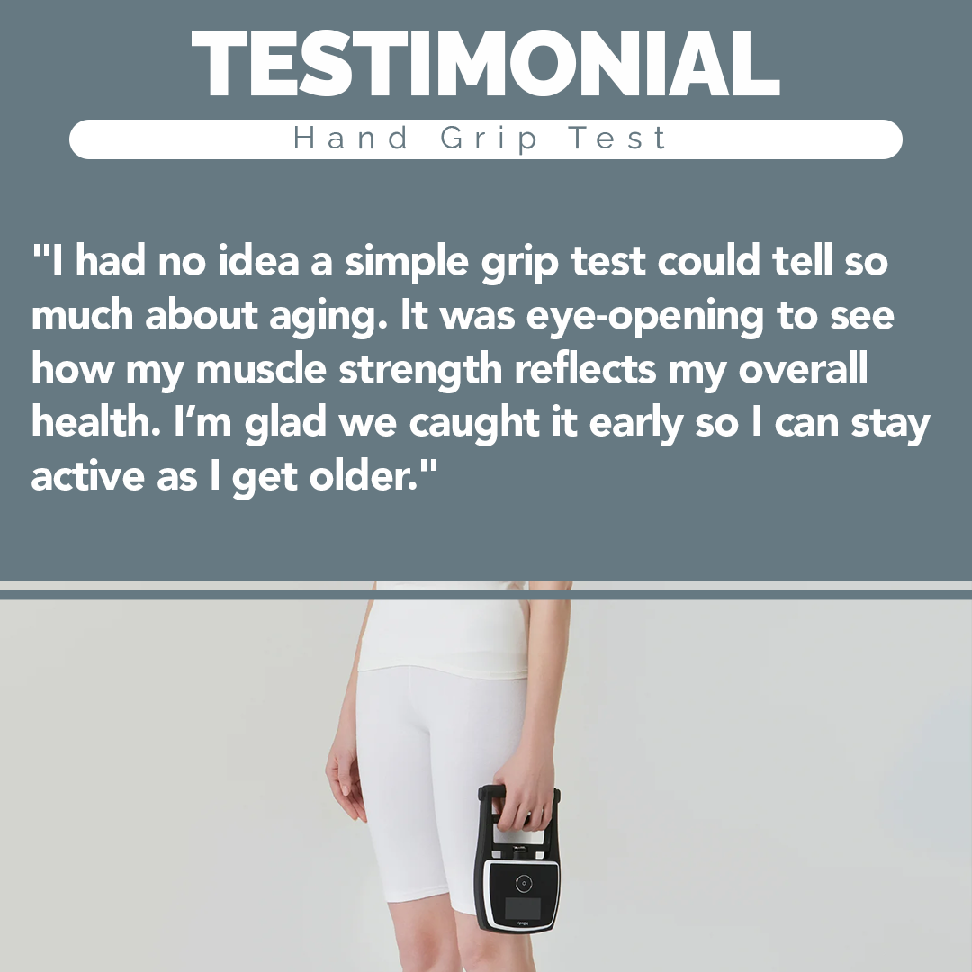 🔹Hand Grip Strength Test: While a handgrip strength test may seem straight forward, it is one of the most significant biomarkers for predicting your future health. Muscular strength is a fundamental factor that directly influences one’s physical capabilities and serves as a predictive indicator for overall health. Handgrip strength, in particular, strongly correlates with one’s overall body strength. This correlation makes the assessment of handgrip strength apractical alternative to gauging overall strength. Moreover, handgrip strength is an economical and convenient method for measuring muscle strength.